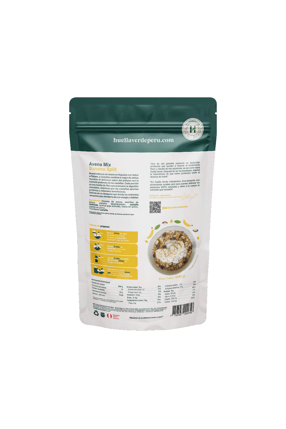 Nuestra mezcla de Avena en Hojuelas con sabor a plátano y castañas, combina lo mejor de dos mundos: el delicioso sabor del plátano con la nutrición poderosa de las castañas. Cada porción es una fuente de fibra que promueve la digestión saludable mientras que las castañas aportan proteínas y minerales beneficiosos.